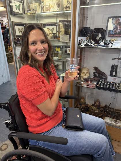 The Nesst has a wheelchair accessible ramp at their 9th street entrance. This entrance does not have an accessible button, but one of their staff came out to greet us and hold the door. The bar was just inside of that entrance with a space where I could wheel up to order my drink. While the countertop was not an accessible height, I was still able to talk with the bartender. They have designated cups for the DORA drinks.