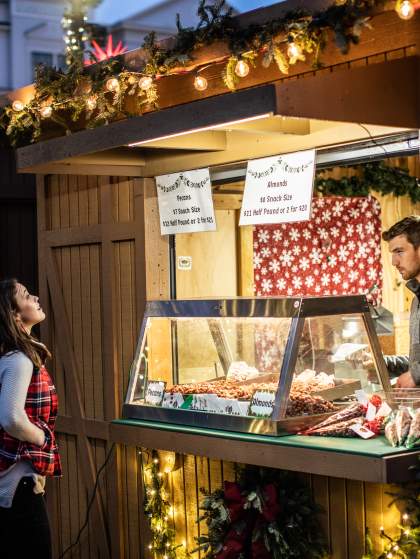 Beneath twinkling lights, browse more than 50 wooden huts selling authentic products imported from Germany, like wooden toys, nutcrackers, music boxes, ornaments and more. Don’t miss the collectible items like the boot mug and Bierkrüge for adult beverages.